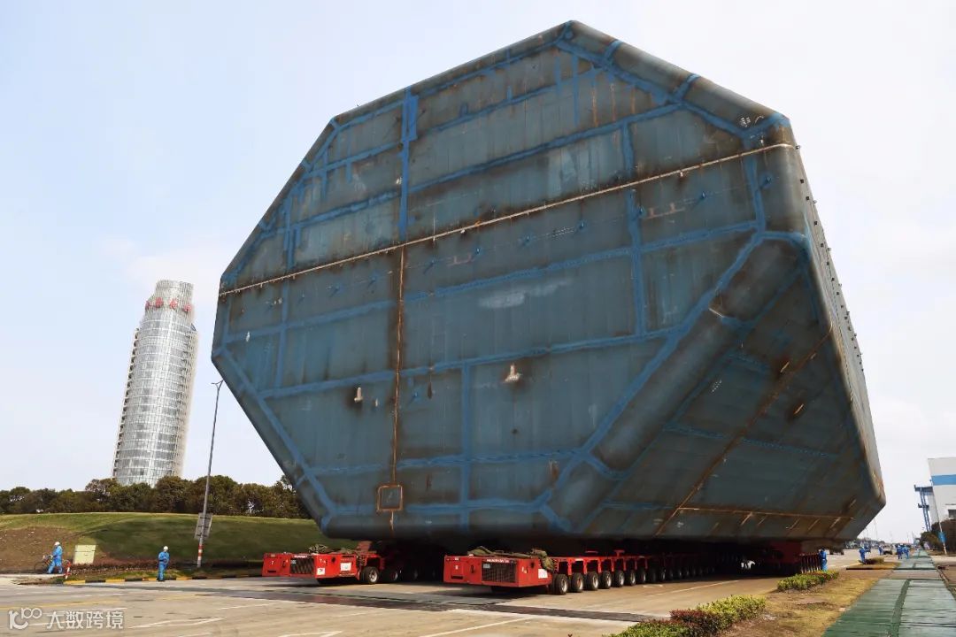 绝缘安装难度大、施工时间长、环境要求高,为此, B型舱从总组平台转场到室内船台,这对于驳运、吊装团队来说,堪称“挑战不可能”。室内船台在完成搭设脚手架之后,B型舱两侧剩下的通道甚至容不下一个成年人转身;同时液舱的长度与江南大道至跨间门口的宽度相比相差小,大件驳运团队总说他们这是“螺蛳壳里做道场”。做完绝缘之后的B型舱更加要小心翼翼,考虑到B型舱重量几乎接近大型龙门吊的极限安全吊重,单靠其本身的鞍座,不足以作为全部的顶升受力点,还需要预留绝缘修补点。经过多次方案优化,预留点从70多个降到30个,节省了一半以上的时间。