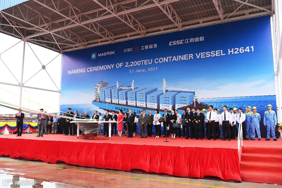 王振勇在致辞中感谢了马士基集团、江南造船、七〇八所、贸易公司、中国船级社为该项目作出的贡献。他表示,中国船舶集团作为船舶工业的“国家队”和主力军,以丰富的建造经验和突出的建造实力,为系列产品的顺利交付打下坚实基础。他充分肯定了江南造船在全系列液化气船、超大型集装箱船以及公务船、科考船、破冰船等特种船舶等方面的设计建造能力!他表示,中国工商银行将继续坚持国际视野、全球经营,紧紧围绕服务国家重大战略实施,融入和更好的服务“双循环”新发展格局,发挥好桥梁纽带作用,积极支持中国船舶制造提质升级,助力更多中国船舶走向世界,搭建起全世界贸易和友谊的海上通道。