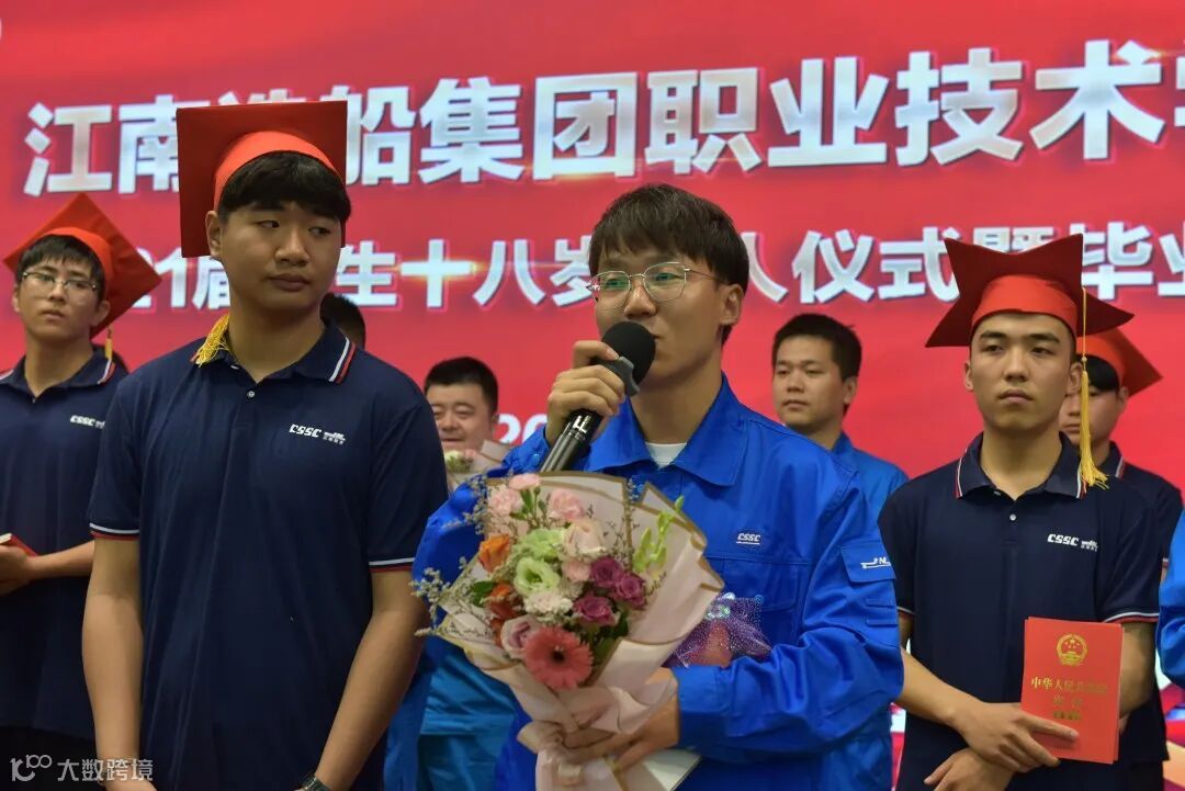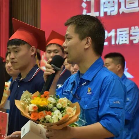 18船机3班李文杰代表全体2021届学生发表了毕业感言。他表示,这是一场注定将刻在记忆的典礼,今后将牢记学校的恩情和嘱托,不辜负学校的期望,刻苦努力,创造出属于自己的美好未来。陆银杰、曹俊男、史凯三位教师代表为毕业生寄语,他们表示,江南造船是真正“成型、成人、成才”的地方,希望同学们常怀感恩之心,常回母校看看,并祝愿江南技校2021届全体毕业生在人生崭新的航道上,乘风破浪,扬帆远航!