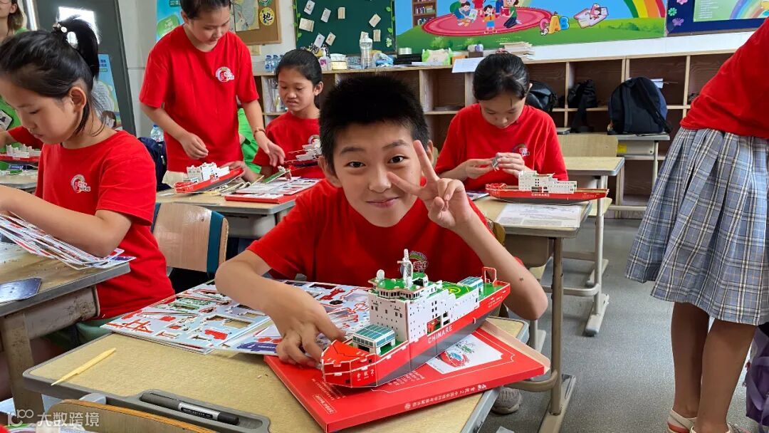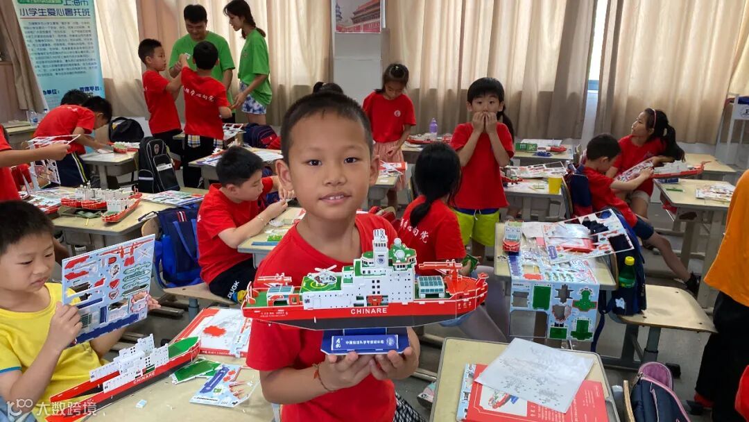 学习完“雪龙2”号的建造故事,当然需要趁热打铁亲手再“建造”一艘属于自己的破冰科考船!公司“爱心学校”团队此行也为长兴镇办班点的小朋友们带来了“雪龙2”号文创纸模。可爱的小朋友们在大哥哥大姐姐们的带领下,化身船舶建造大师,沉浸于“造船”的乐趣之中。