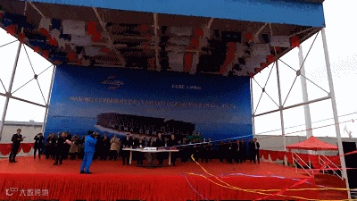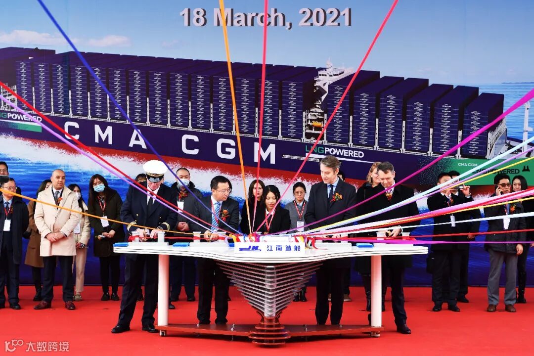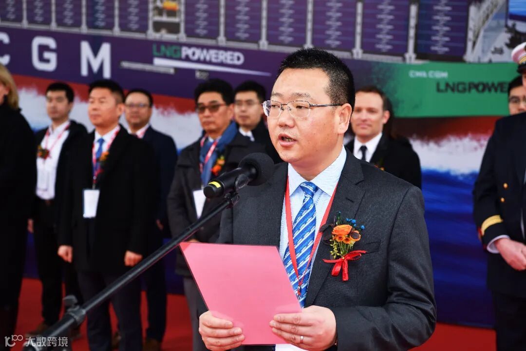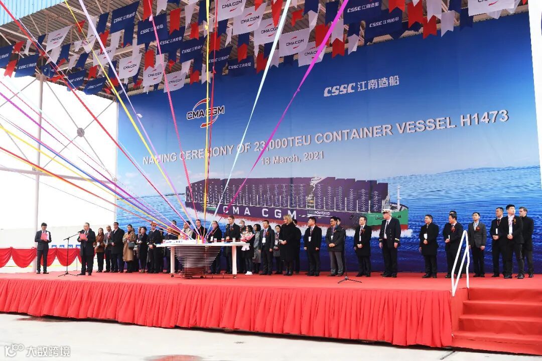无境深蓝创始人王淼女士为新船命名,达飞中国首席执行官何律铎先生、首席商务官奥黛丽·多恩女士,江南造船总经理黄文飞、副总经理陈卫平等出席仪式。