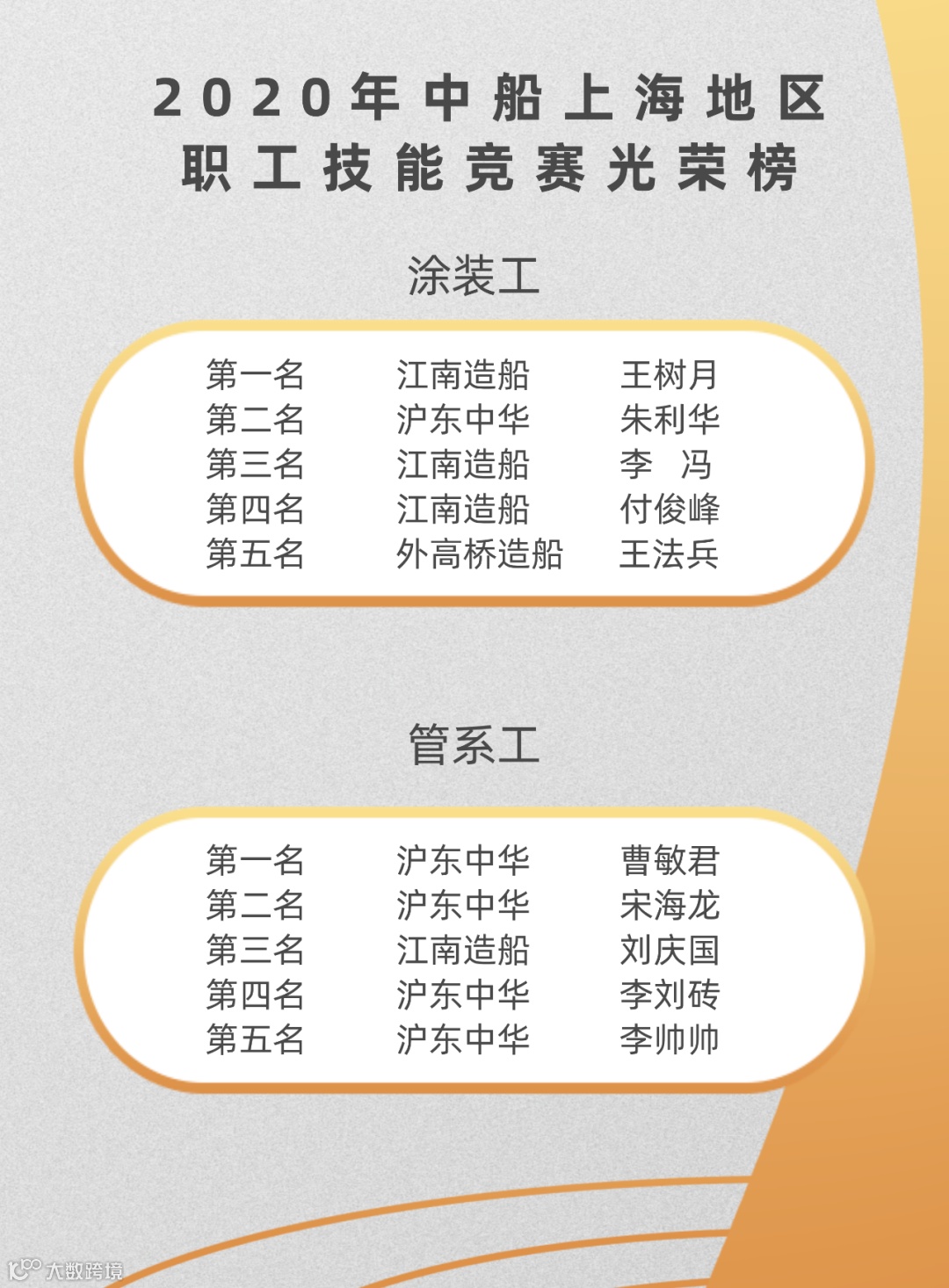 最终,公司涂装一部参赛选手王树月、李冯、付俊峰获得船舶涂装工项目第一、第三、第四名的好成绩,王树月被被授予“中船上海船舶工业有限公司技术能手”称号;江南技校参赛选手刘庆国勇夺船舶管系工项目第三名,在管系工项目上取得历史突破。江南造船和沪东中华获得本次竞赛优秀组织奖。