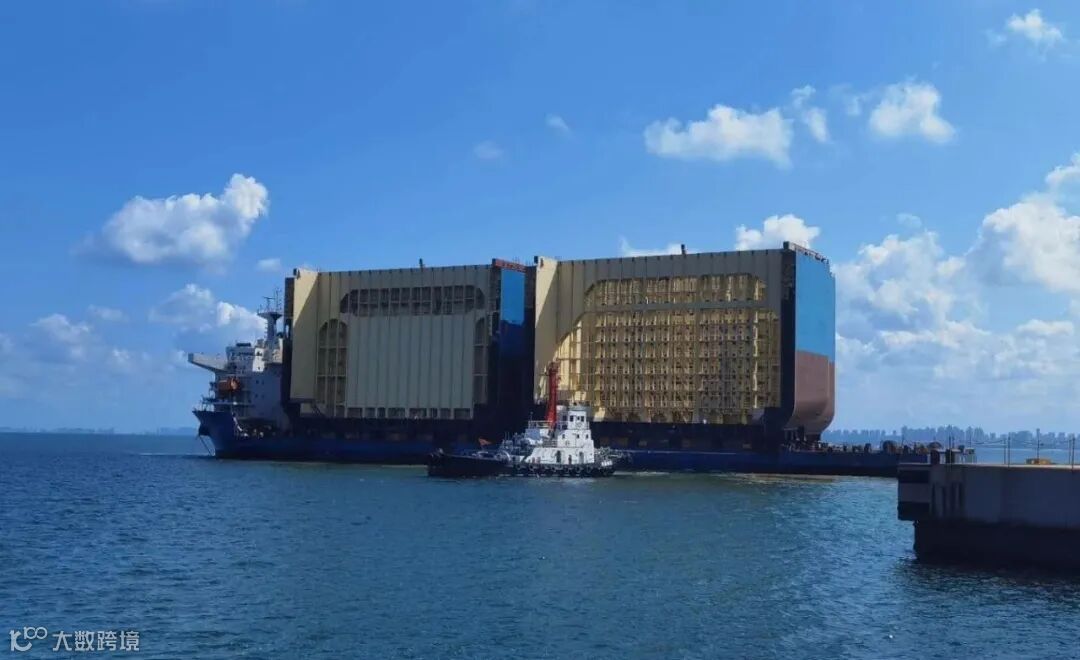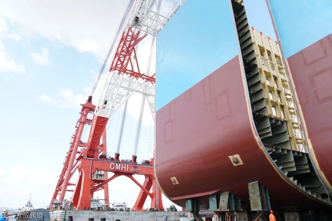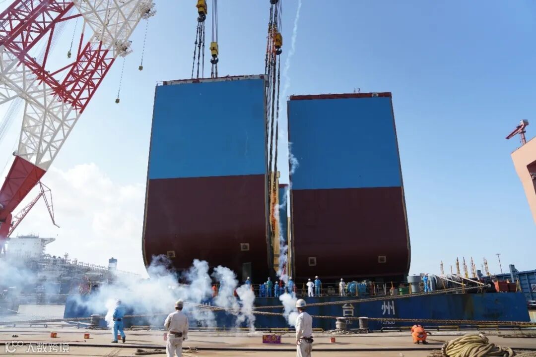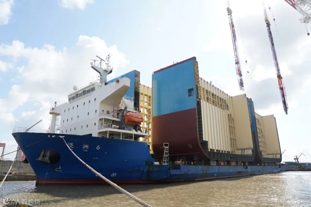 9月28日下午2点20分,中国船舶集团旗下江南造船建造的15000TEU集装箱船首制船4只货舱区域环段在码头顺利起吊,将在3号坞安下“新家”等待后续搭载。该批环段平均重量达2000吨,经过524海里的“长途奔袭”,成功实现异地驳运,标志着公司巨型总段滚装驳运技术再上新台阶。