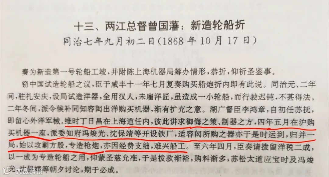 曾国藩是江南机器制造总局创建人之一,他在奏折中明确指出江南机器制造总局建于同治四年5月较为可靠。