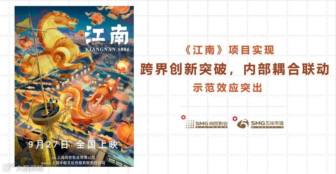 《江南》由江南造船旗下上海中船文化传媒有限责任公司和SMG影视业务旗舰平台——上海尚世影业有限公司联合出品,这对于中船集团和江南造船而言也是首次触“电”,中船集团党组高度支持,集团党群工作部等相关部门也多次牵头联系,最终促成了双方的成功合作。影片讲述了清末浦江岸边,少年阿榔与机匠陈铁寒师徒等人齐心为国效力,修护战舰、制造军械的故事。作为第一部民族重工业题材的国产动画,影片以江南造船前身江南制造总局为原型,以具有幻想色彩的动画形式展现了小人物在民族大义和国家命运面前的大情怀。大银幕上的动画少年志,抒写了中国船舶工业的燃情岁月。该片既是描绘上海民族工业发展、抒写上海城市风骨的“上海出品”,擦亮“上海制造”名片的有益实践,也是充分利用“红色文化、江南文化、海派文化”资源,将“上海文化”品牌建设融入城市血脉的可贵探索。