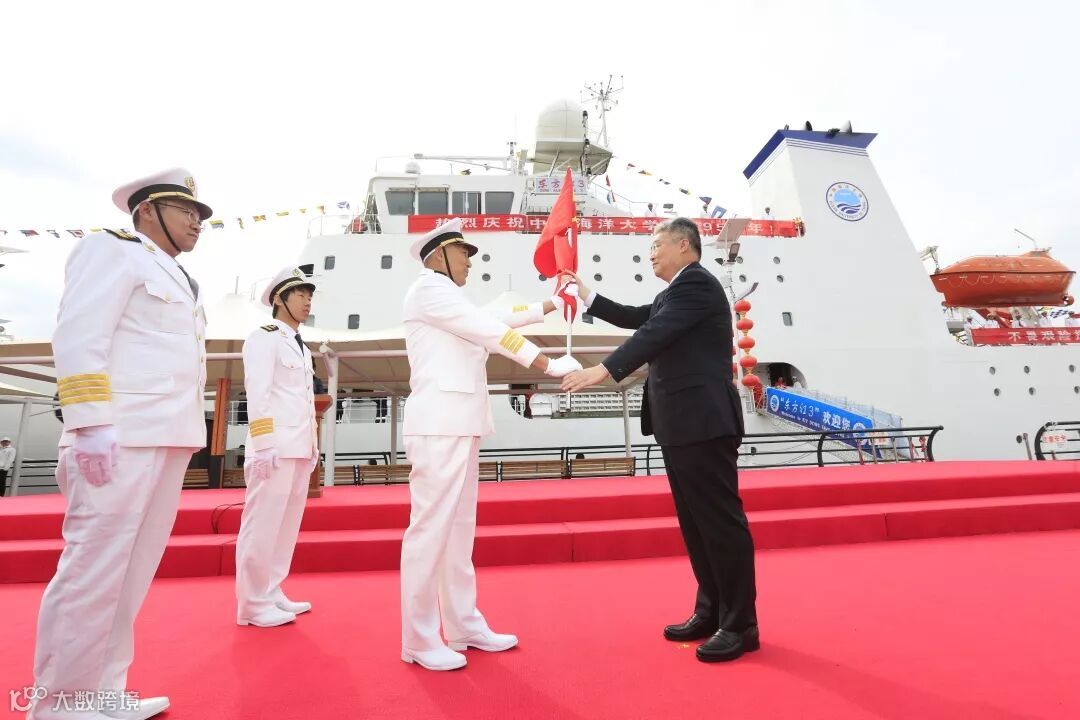 中国海洋大学校长于志刚为“东方红3”号船长蒋六甲授旗