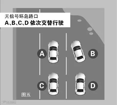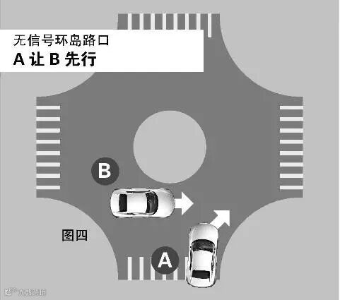 除了交叉路口,在环形路口或者道路状况特殊的路段如何让行,也是众多司机的知识盲点。针对以上情况,郝老师做了相应的解答:“环形路口地形比较特殊,一般没有信号灯控制,各个方向的来车须逆时针绕环岛行驶,同时要注意通行顺序进行有效避让。准备进入环形路口的车辆,应当让已经在路口内的机动车先行(如图四)。当然,如果环岛安装了信号灯,就需要按信号灯指示行车。”
