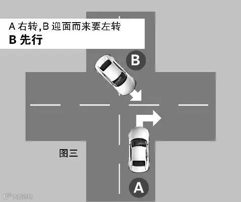 对于网上流传的其他几条行车避让规则,郝老师也一一做了解读:一、你和我,先要按交通信号的指示通行。这一说法正确,无论在哪个路口,都必须要按照交通信号指示通行。需要提醒的是,交通信号不仅仅是红绿灯,地面的标志标线、交警指挥也属于交通信号范畴。二、我右转,你迎面而来欲左转,你先。这一说法正确。符合第五十二条第(四)条规定——相对方向行驶的右转弯的机动车让左转弯的车辆先行(如图三)。