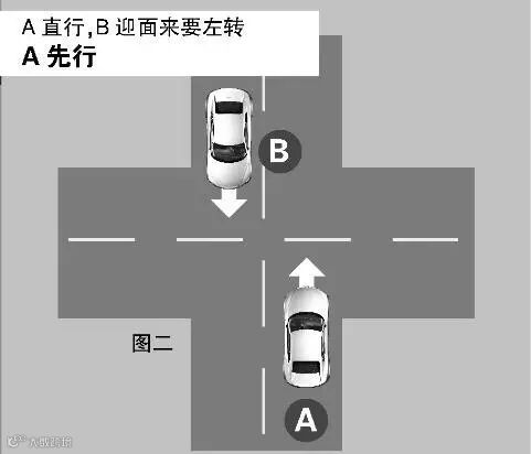 另外,对于交叉路口的礼让规则,《条例》第五十二条第(三)条规定还有相应补充:转弯的机动车让直行的车辆先行。针对这条规定,郝老师给我们做了进一步的解释:“这里的转弯,是指左转弯和右转弯;车辆是指所有的车辆,即机动车和非机动车。我们应当全面的理解和应用法规,具体的说法有以下两点:一是相对方向进入路口的车辆,左拐弯的车要让直行的车先行(如图二);二是一侧进入路口要右转弯的车辆,遇到左侧进入路口直行的车辆,右拐弯的车要让直行的车先行。”