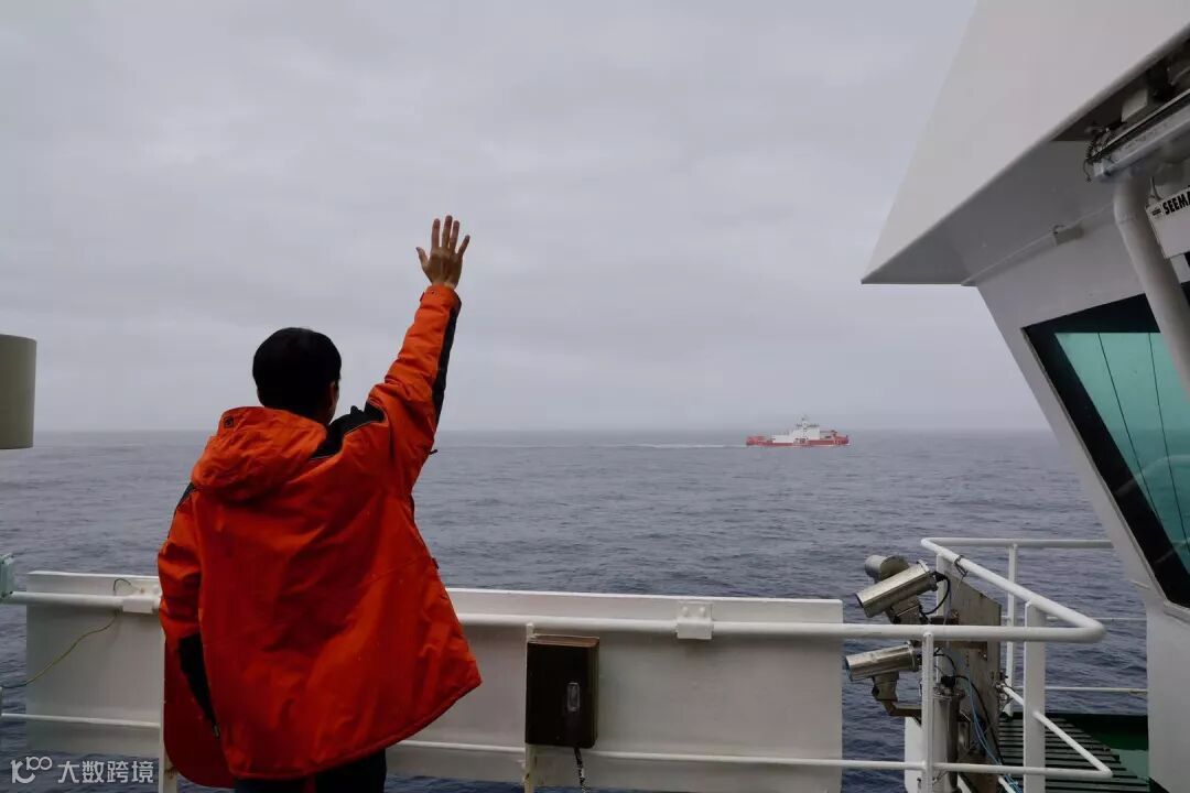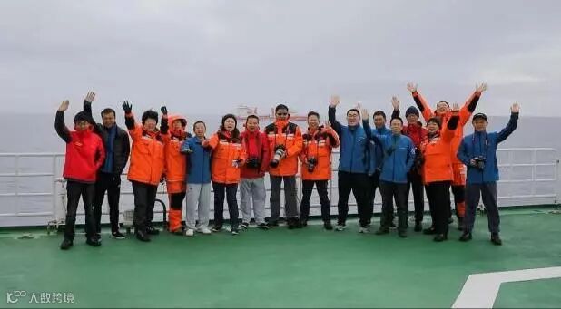 考察队员与远方的“雪龙”号合影(来源于央视新闻)