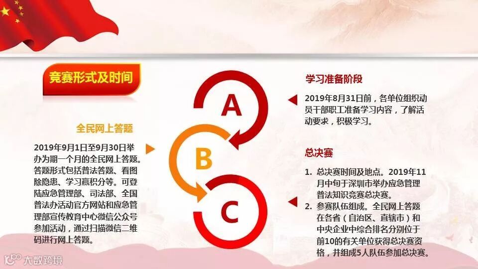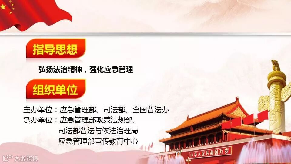 为进一步落实《中央宣传部、司法部关于在公民中开展法治宣传教育的第七个五年规划(2016—2020年)》相关工作部署,普及应急管理法律法规,培育应急法治文化,应急管理部、司法部、全国普法办决定开展2019年应急管理普法知识竞赛