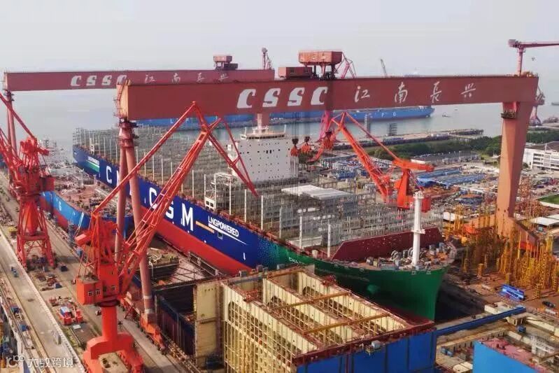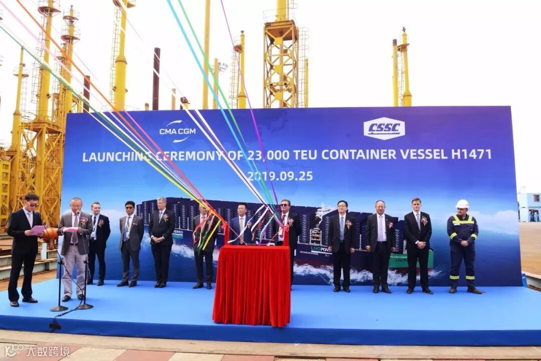 9月25日,江南造船为法国达飞海运集团建造的23000TEU集装箱船“CMA CGM CHAMPS ELYSEES”下水,该型集装箱船由中船集团第七〇八研究所研发设计,入级法国船级社(BV)。总长400米,型宽61.3米,服务航速22节,载重量近22万吨, 载箱量达23000TEU,可运载2200个40英尺冷藏集装箱,为全球在建最大级别的集装箱船,满足全球最严格排放限制区域的排放标准,船舶能效设计指数(EEDI)达到第三阶段标准。