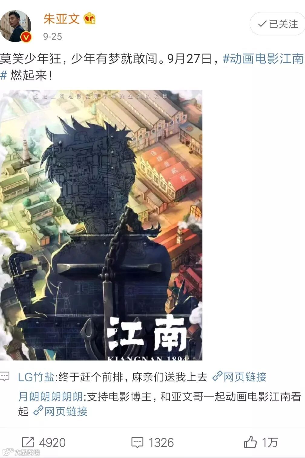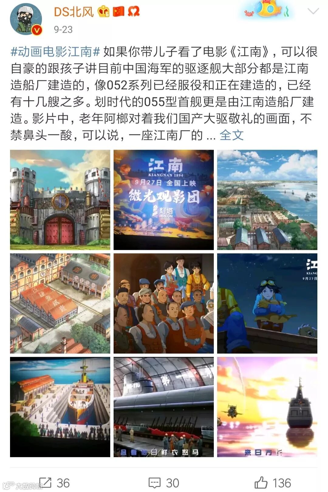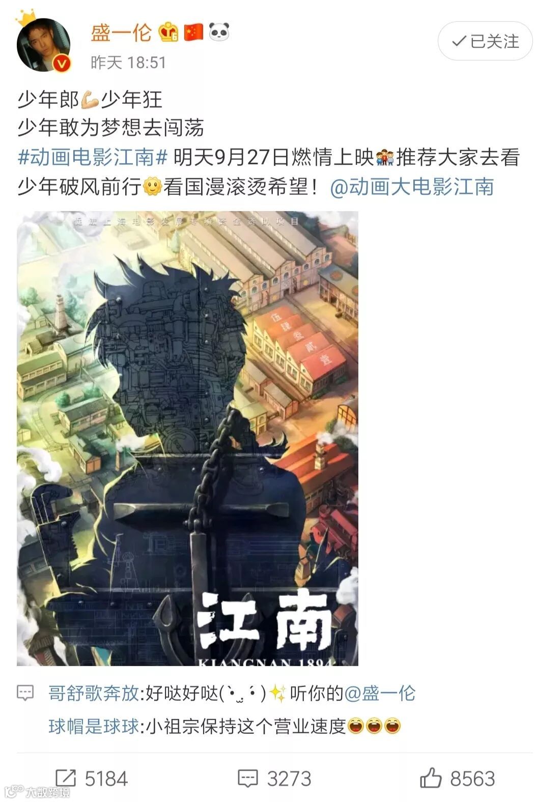 从点映至上映日,国漫新片《江南》已经收获了观众的无数好评,激起了从军迷、历史迷到科技迷的观影热情,演员朱亚文、盛一伦等明星也在微博上诚意推荐。影片独特的历史题材,所表现的少年励志成长故事吸引了众多青少年和家庭观众。