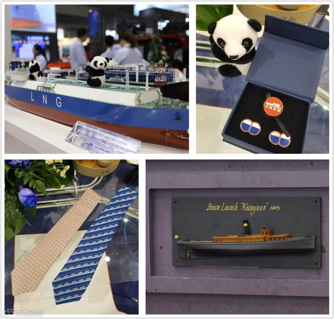 本次展位的设计与布置充满了江南元素和江南特色,吸引了许多观众的驻足。江南造船的纪念品更是具有中国元素和江南元素,其中包括观众所喜爱的中国小熊猫玩偶,江南双耳C型罐袖扣、江南特色领带和丝巾等。