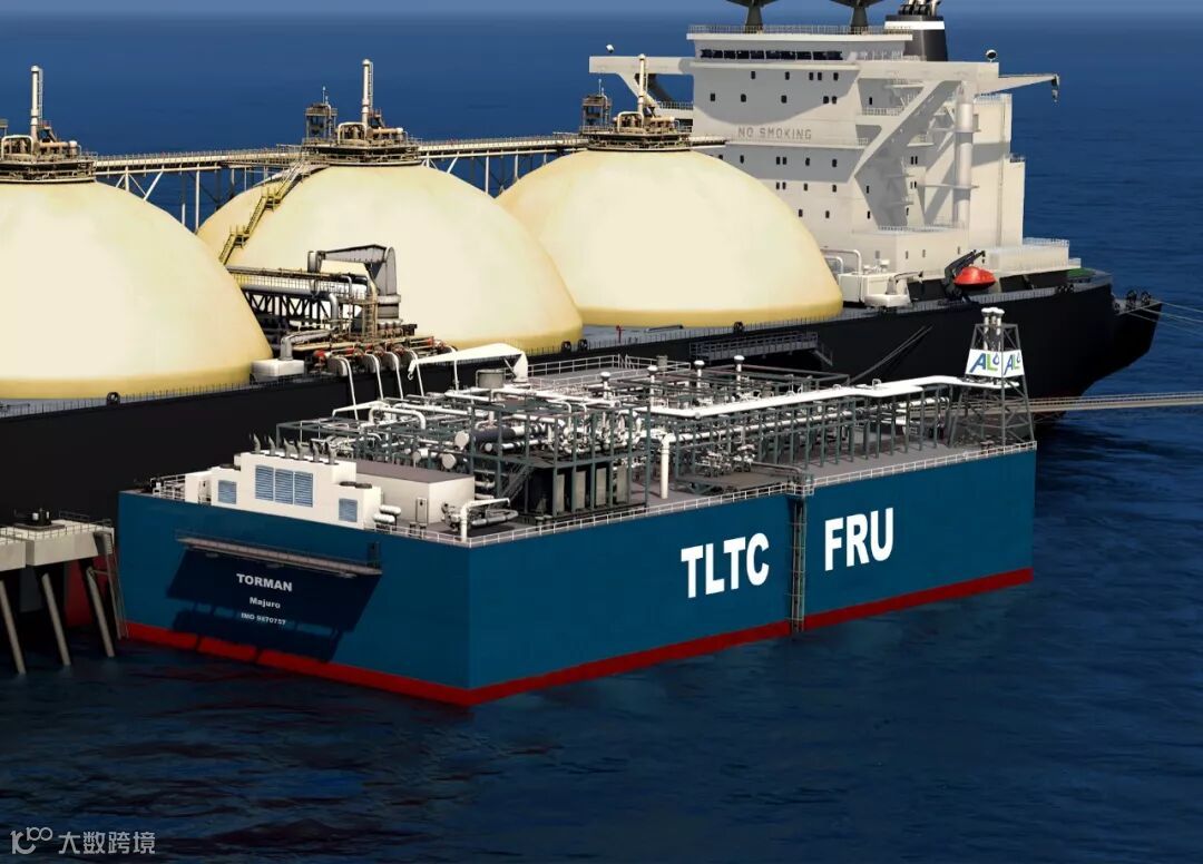 该FRU入级BV船级社,由德国TGE公司提供概念设计和液货系统,总长94.9米,宽38.4米,配备四台6L34DF双燃料发电机,两个14000立方米的C型圆柱罐,5套再气化模块,再气化能力高达335吨/小时,是目前再气化能力最大的C型罐中小型FSRU。