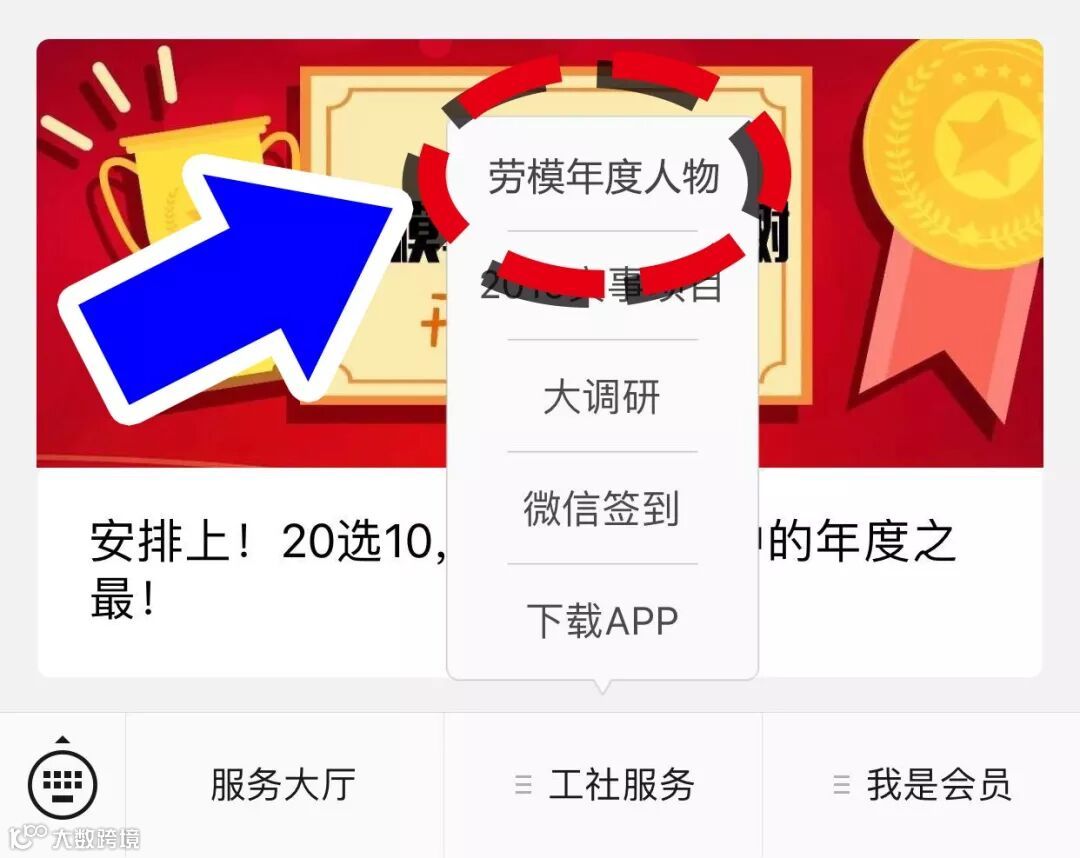 在申工社微信界面菜单栏,点击【工社服务】-【劳模年度人物】进入投票页面。