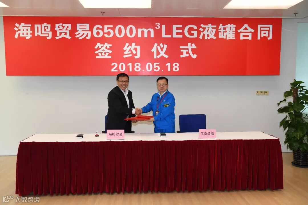 5月18日14时,海鸣贸易6500m³ LEG液罐建造合同签约仪式在江南造船举行,上海海鸣贸易有限公司董事长吕毅与江南造船总工程师胡可一在建造合同上签字。上海海鸣贸易有限公司董事韩军、英国LGE中国总代表Kitson Chiu出席了仪式。