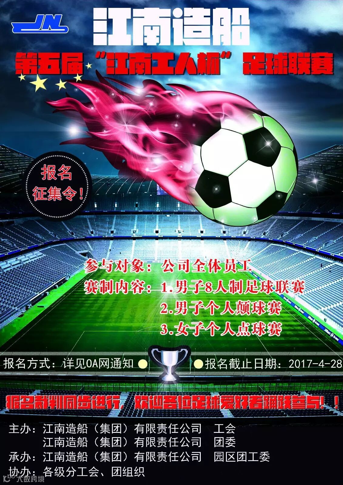 为了团结公司员工,提高集体凝聚力及团队意识,加强广大员工的生产战斗力;丰富公司广大员工业余生活,展现新时代江南人蓬勃朝气的风貌,弘扬“自强不息”的江南精神,江南造船工会和团委定于2017年5月~7月联合举办第五届“江南工人杯”足球赛。