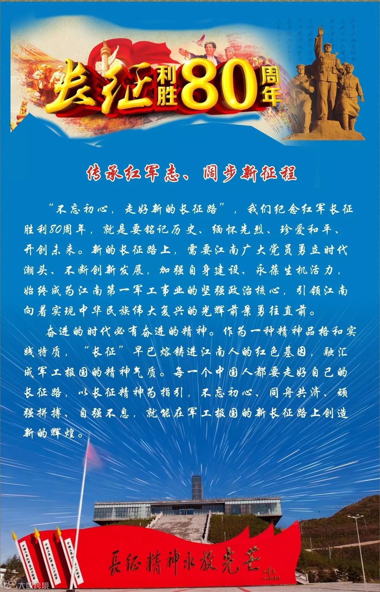 正值红军长征胜利80周年之际,江南造船结合“学党章党规、学系列讲话、做合格党员”学习教育的开展, 组织举办了主题展览、邀请专家讲述长征精神、集中观看长征胜利80周年纪念大会等活动,教育江南员工弘扬长征精神、践行军工报国。