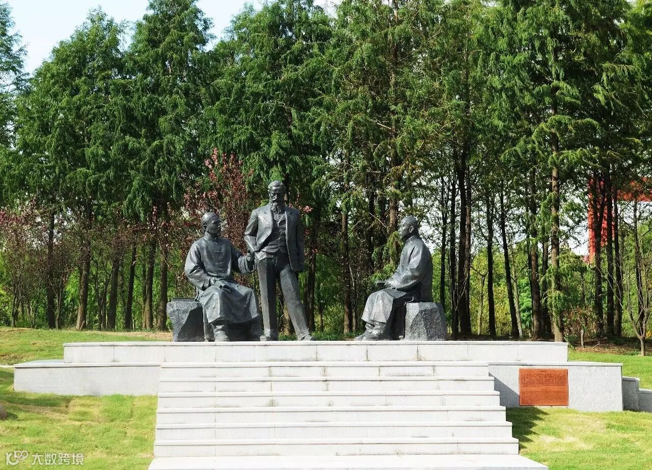 绿树围绕中,银灰色调的基座上,徐寿、华蘅芳端坐于石凳上,傅兰雅站立其后,只见徐寿左手微扬,似在阐述着科学理念,华蘅芳与傅兰雅全神贯注或在聆听,或在深思,三人目光交汇,传递着知识和力量,播撒着民族工业的火种,折射出科学家勇于担当的精神气质和民族情怀。