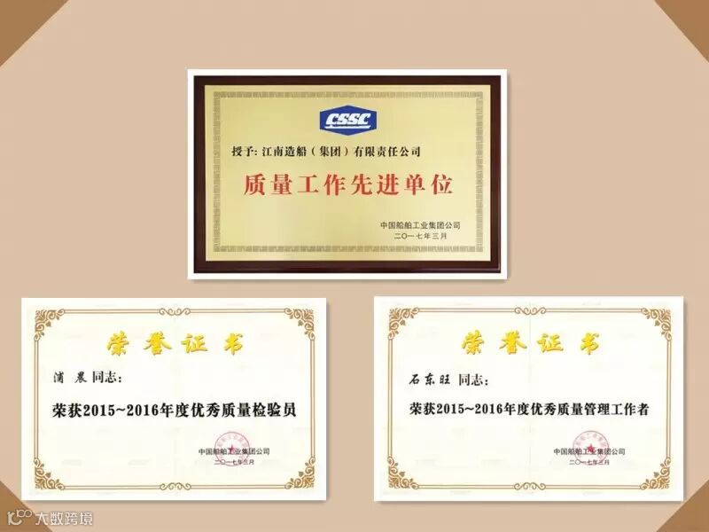 2017年3月17日,中国船舶工业集团公司“2017年度质量工作会”在上海召开,会议对2016年集团内优秀质量单位、质量小组和质量工作者进行了表彰,江南造船被授予“质量先进单位”,品质保证部石东旺、浦晨荣获“优秀质量管理工作者”和“优秀质量检验员”。