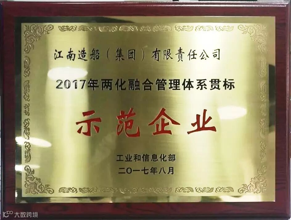 2017年8月17日,工信部正式公布了2017年全国两化融合贯标示范企业的名单,全国仅有50家企业获此殊荣,江南造船(集团)有限责任公司荣膺该称号。8月26日,“2017中国两化融合大会”在北京国家会议中心召开,对示范企业公开授匾。江南造船作为仅有的两家上榜船舶企业之一,本次获奖意味着江南造船两化融合的进程走在行业前列,成为全国两化融合现代化生产制造与运营管理的标杆。