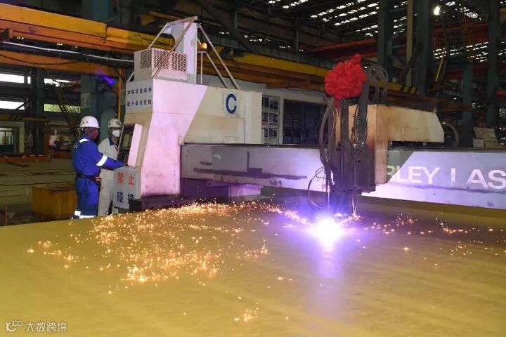 开工仪式在江南造船制造部切割车间举行,船东代表点火切割新船钢板。