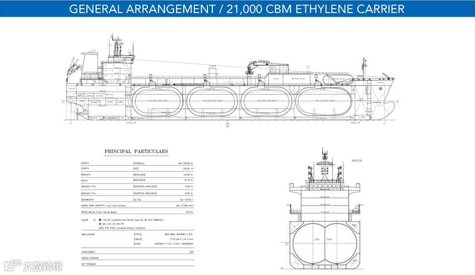 “Lusitano E”21,000立方米LEG船是江南造船近年来自主研发的新一代两万立方米级的液化气船,它满足最新规范、规则要求,具有经济、节能、环保的特点。该船型设计在主尺度,线型,总布置,完整稳性和破舱稳性分析等方面都进行了优化,并综合考虑了船东的实际使用情况和普遍需求。