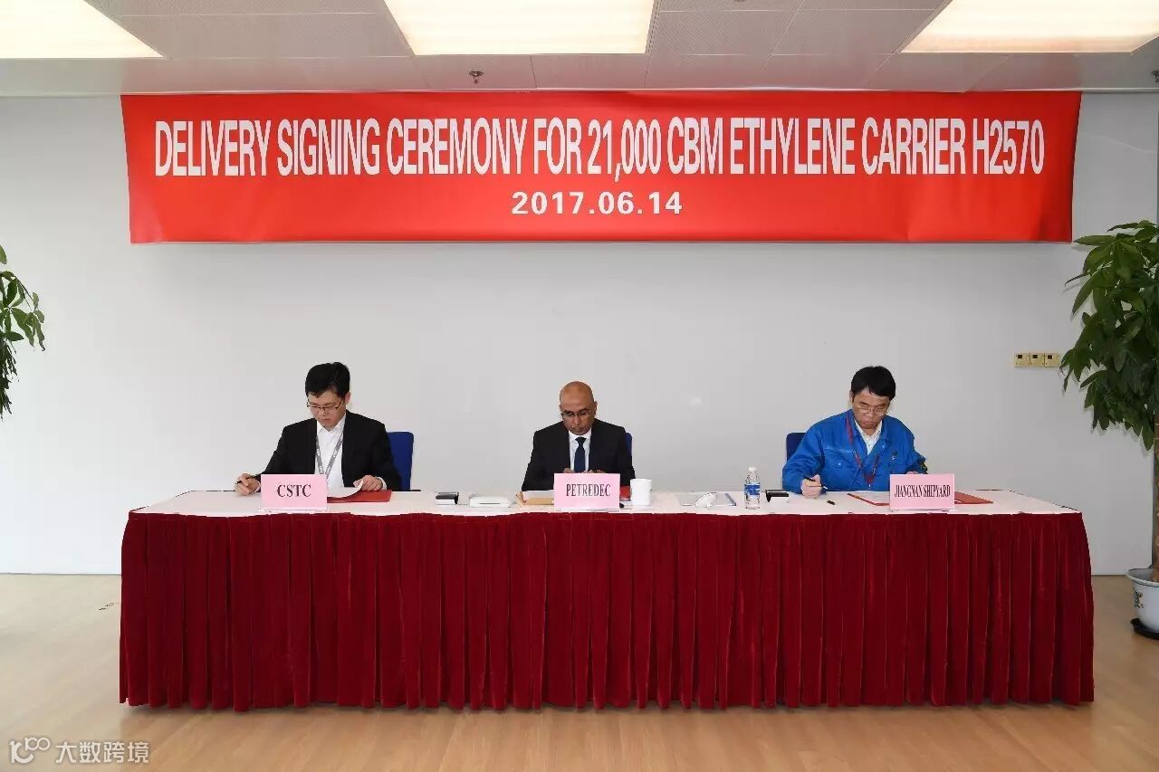 6月14日,江南造船为Petredec Limited建造的Lusitano E系列的最后一艘船签字交船。Petredec Limited船舶运营总监DabiruVenkatraman,驻厂监造组组长Ranjan Varghese,中国船舶工业贸易公司海工及特种船部副总经理陈建国、高级项目经理顾亚男,江南造船副总经理张俭出席交船签字仪式。Petredec Limited在江南造船共订造了4艘Lusitano E乙烯运输船,该型船为江南造船自主研发、设计、建造的21,000立方米半冷半压乙烯运输船,该系列船入籍DNV-GL,适用于GL规范。