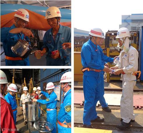 渐渐地,送清凉活动已经变成了一种日常生活,每天都能看到一些人或提着茶壶或拿着棒冰,或带着毛巾或捧着冰桶,从平台到码头,从甲板到机舱,他们跑遍全船,爬分段,钻舱室,为生产一线的作业员工送上一抹清凉,并亲切询问他们的身体情况,叮嘱他们在高温季节注意休息,更要注意安全生产。
