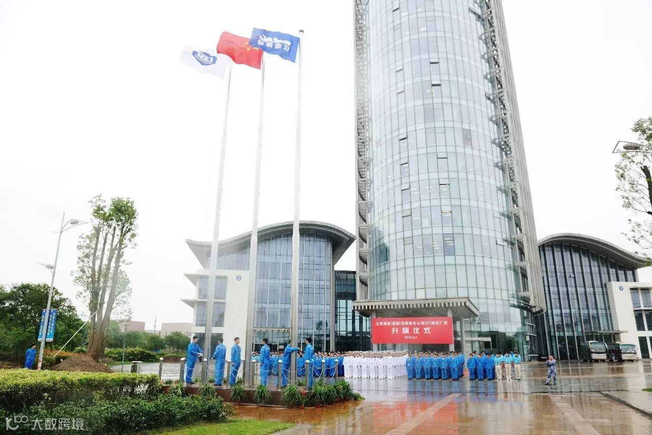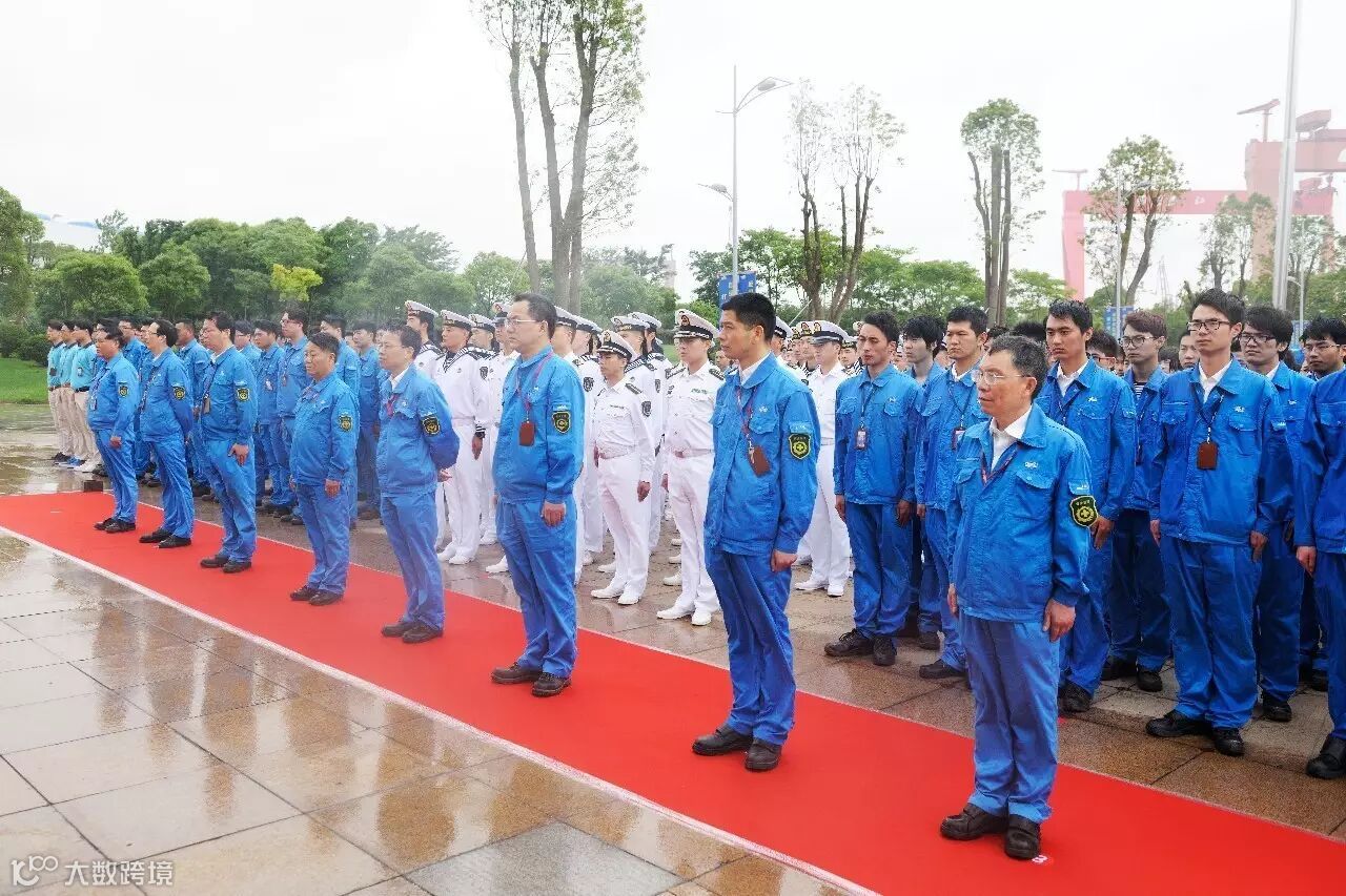 伴着庄严的国歌,五星红旗冉冉升起。随后,中船集团司旗及江南造船司旗也在江南长兴之歌的伴奏下升起。