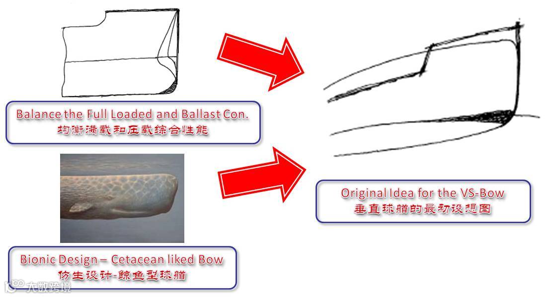 VS-Bow是由江南造船自主开发设计的创新型船舶线型,现已获得了国家发明专利授权,该线型兼顾传统的整流、消波作用,同时改善了肥大型船舶满载状态下波浪中失速较大的问题。