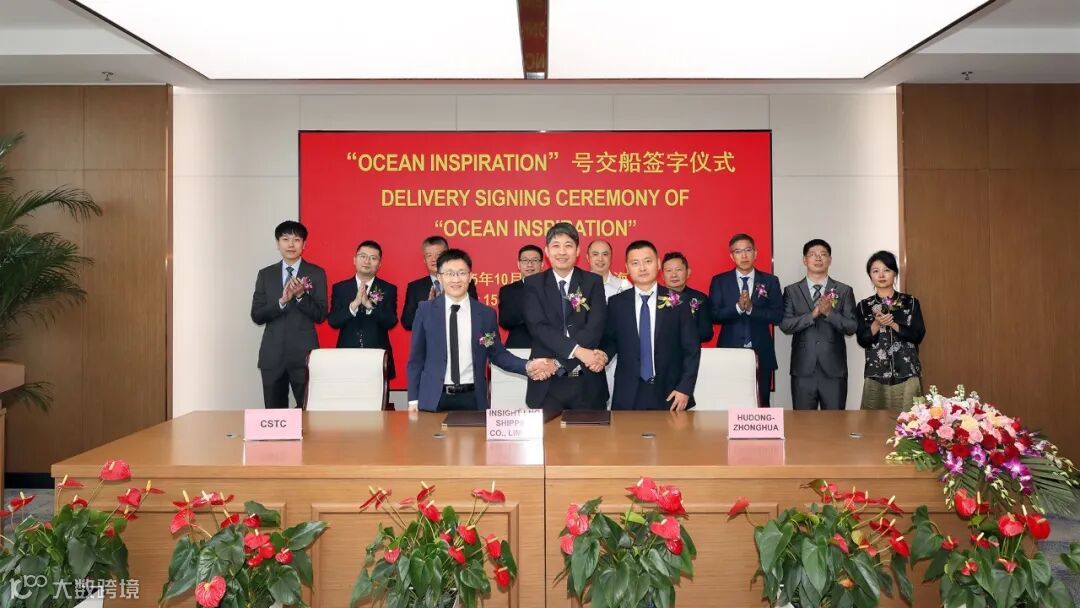 公司近日接连上演交船“大戏”,10月15日,中化石油项目17.4万方大型LNG运输船“远海奋进”轮签字交付,实现3天交付2船。上海液化天然气运管部总经理严敏,中船贸易船海业务三部业务经理丁天安,公司总装二部/围护系统部副部长沈杰共同签署交船文件。
