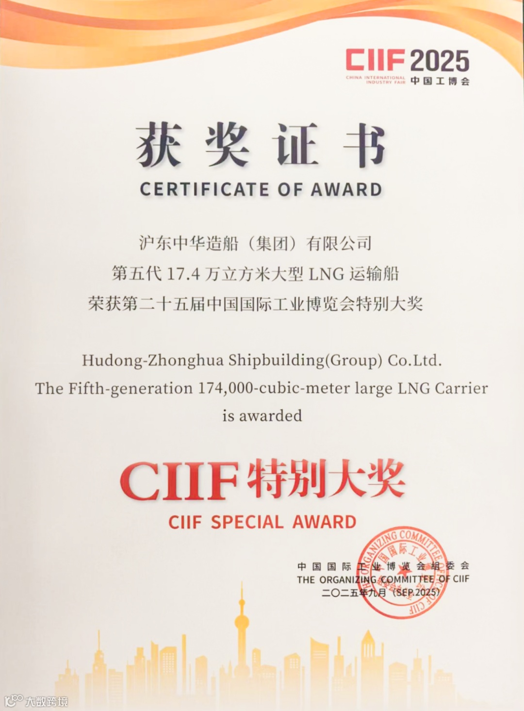 9月23日,公司党委副书记、总经理翁红兵登上第25届中国国际工业博览会颁奖台,代表公司领取本届工博会唯一的CIIF特别大奖。公司自主研发的第五代“长恒系列”17.4万立方米双燃料低速推进LNG船,从数百个参赛项目中脱颖而出,荣登奖项榜首。