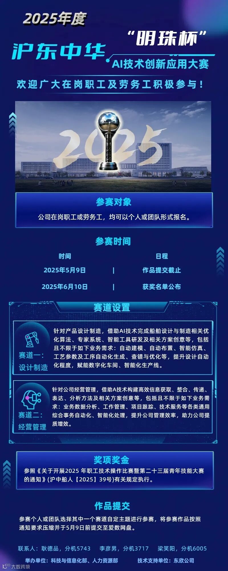 为进一步推动AI技术与船舶工业场景深度融合和企业数智化转型,公司近日举办2025年“明珠杯”AI技术创新应用大赛,邀请广大员工积极贡献智慧与创意,共同探索AI技术在公司设计制造、经营管理等全线业务的创新应用模式,加深对AI技术的理解与认识,挖掘具有实际应用价值的创意内容和设计方案。