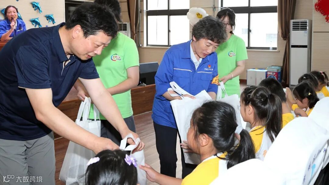 秦蓉与陆卫东共同为孩子们发放学习礼包。