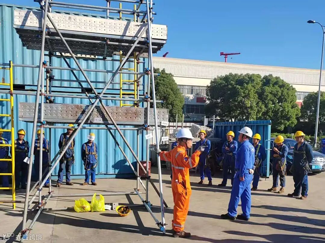 公司有序组织三家脚手公司分批进行脚手搭设及理论培训,对理论知识查缺补漏后在各自脚手堆场搭设一个标准的脚手平台作为实操培训的示范平台,卡能源项目经理代表和船东代表对各家脚手公司实操培训内容进行讲解,脚手培训内容主要涵盖以下几个方面: