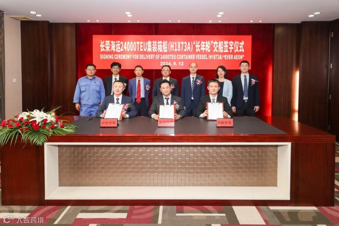公司营销部副部长李青主持交船签字仪式,长荣海运监工室主管刘诗麒、中船贸易船海业务一部副总经理郑民胜和公司长兴造船副总经理刘学东签署交船文本,公司副总经理迟本斌以及其他嘉宾见证。