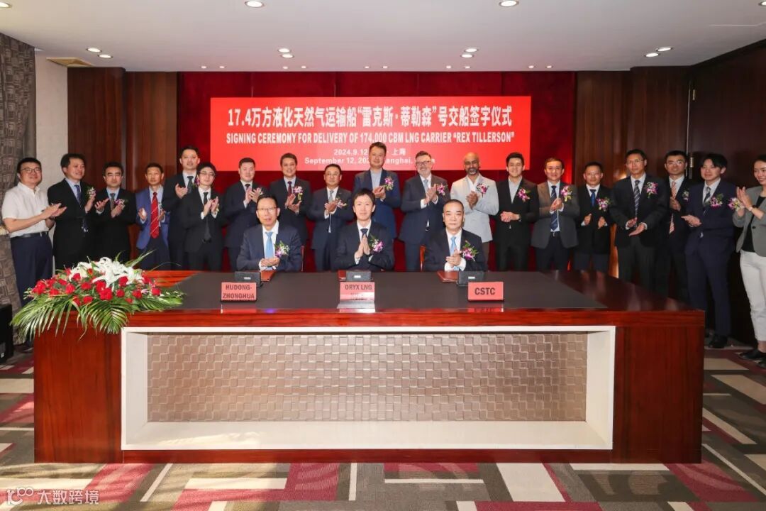 商船三井LNG船海外项目部中亚欧美组总经理进藤隆弘、CSTC 船海业务三部副总经理陆新卫和公司副总经理张秀峰签署交船文本。卡能源液化天然气公司北部气田扩建项目航运项目总经理郭晋挺、卡能源驻厂监造组组长盖尔·布莱特兰、商船三井(中国)副总经理下田盛世、驻厂监造组组长村中乔、中远海运现场驻厂监造组副组长李华松、公司副总经理迟本斌、LNG副总建造师黄华兵等领导嘉宾见证。