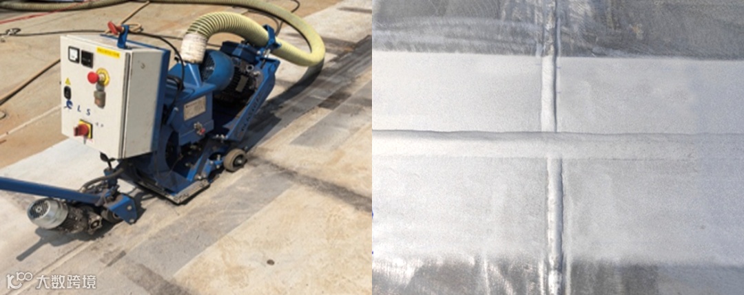 ▲使用甲板抛丸机对货舱甲板焊缝进行处理