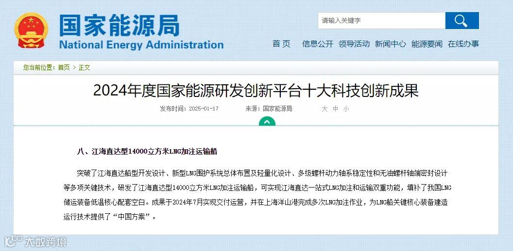 1月17日,国家能源局发布2024年度国家能源研发创新平台十大科技创新成果。公司建造的“江海直达型14000立方米LNG加注运输船”作为船舶行业唯一产品登上榜单,彰显公司在科技创新方面的强大实力。