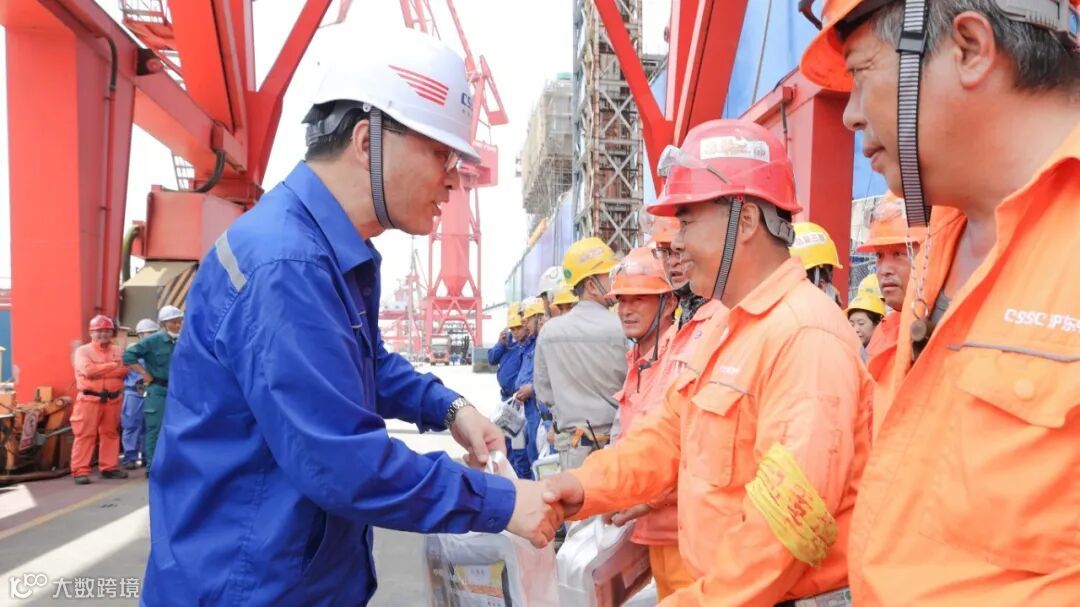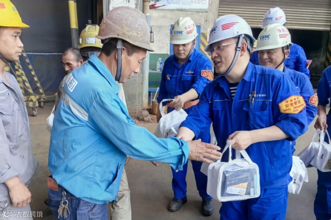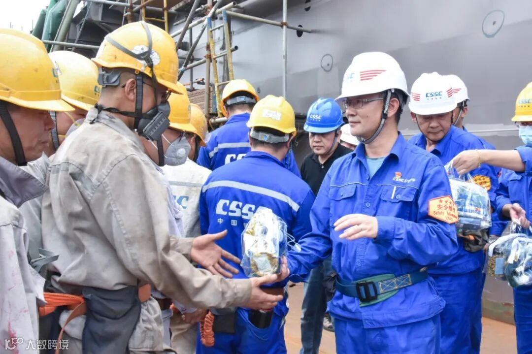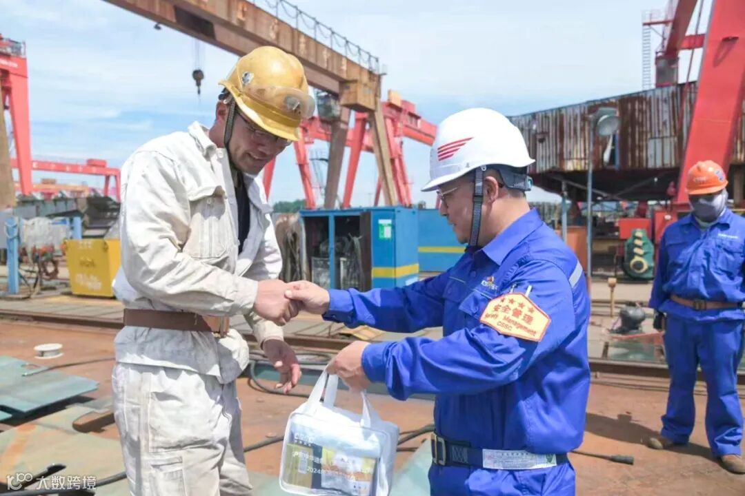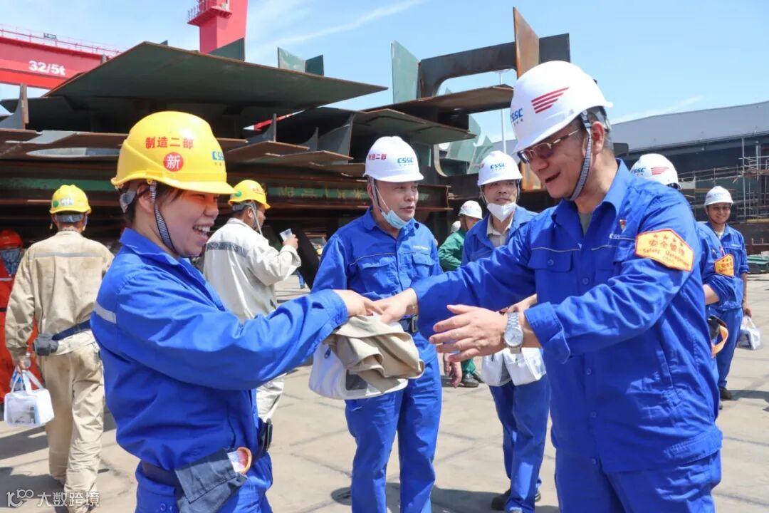 在公司西部厂区二号码头,总装三部800余名员工正在为加快H1793A船码头系泊调试奋力工作。公司董事长、党委书记陈建良来到生产现场,向挥汗如雨辛勤工作的广大员工表达亲切慰问。在送上一份份清凉慰问品的同时,陈建良真切关照现场作业员工守望相助,关爱健康,保障安全;他更要求现场管理人员,必须把困难考虑得更多一点,把安全风险辨识得更充分,针对夏季高温,扎实做好防暑降温、防汛防台和员工关爱工作,确保平安度夏。