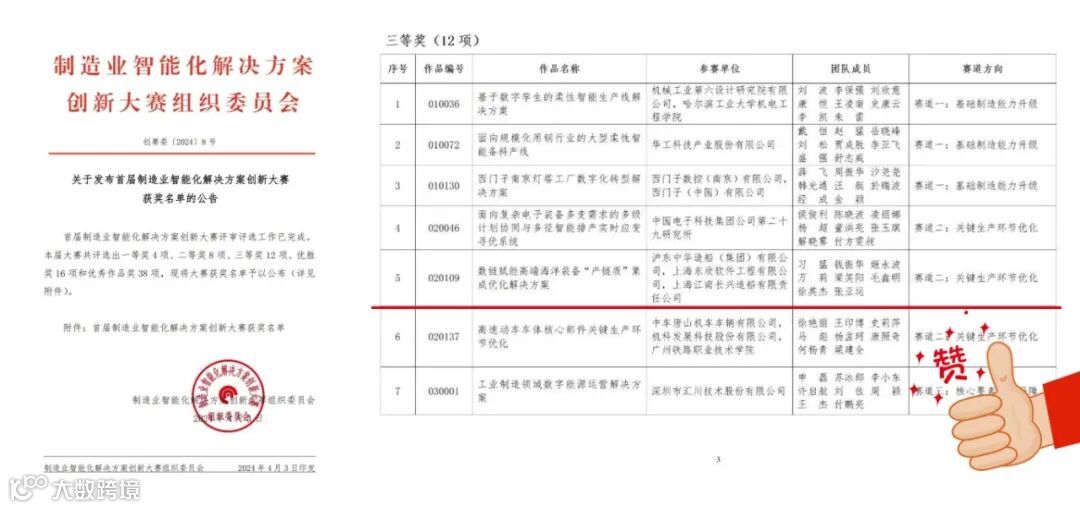 近日,首届制造业智能化解决方案创新大赛总决赛暨创新大会在重庆永川举行。公司从全国80支决赛队伍中再次脱颖而出,获得全国三等奖。这是公司继第五届中国工业互联网大赛摘银后,在数智化创新领域获得的又一荣誉。
