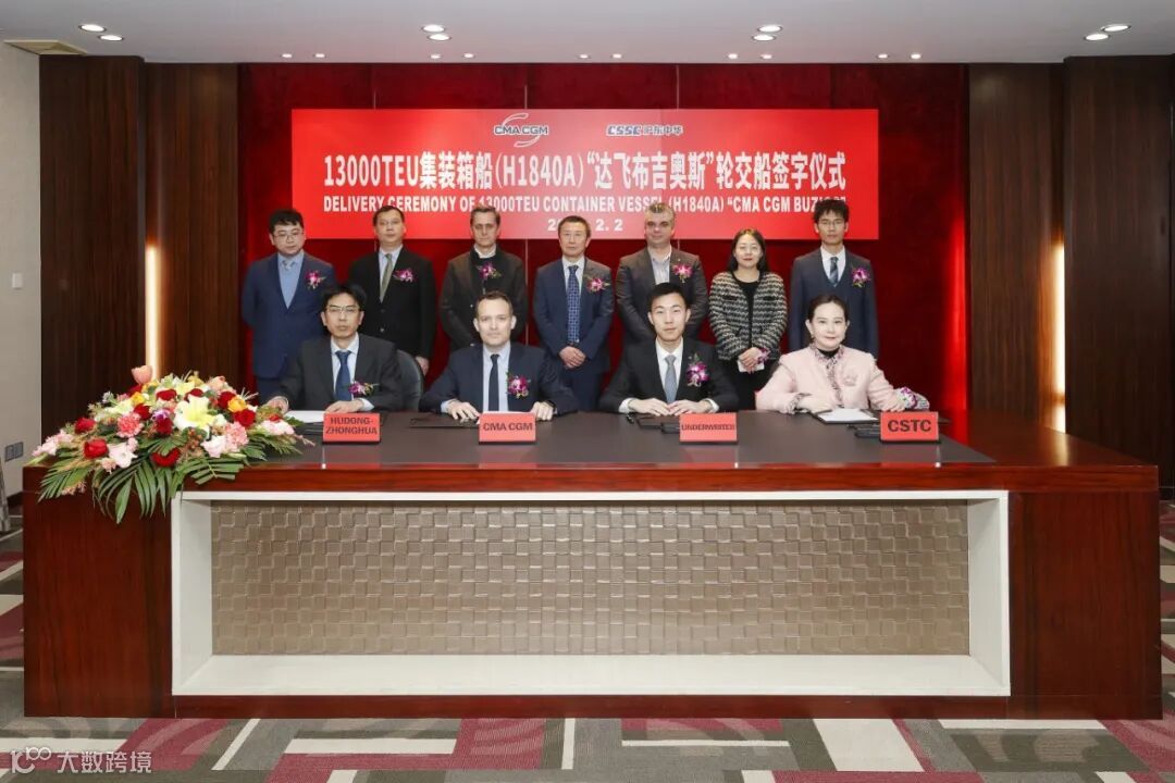 达飞船舶新造船部中国区经理马修、中船贸易船海业务二部授权代表王文丽、沪东中华营销部副部长李青共同签署交船文本。达飞船舶驻场经理戈兰、法国船级社新造船部上海区经理穆斯塔法、长兴造船副总经理刘学东出席“达飞布吉奥斯”号签字交船仪式。