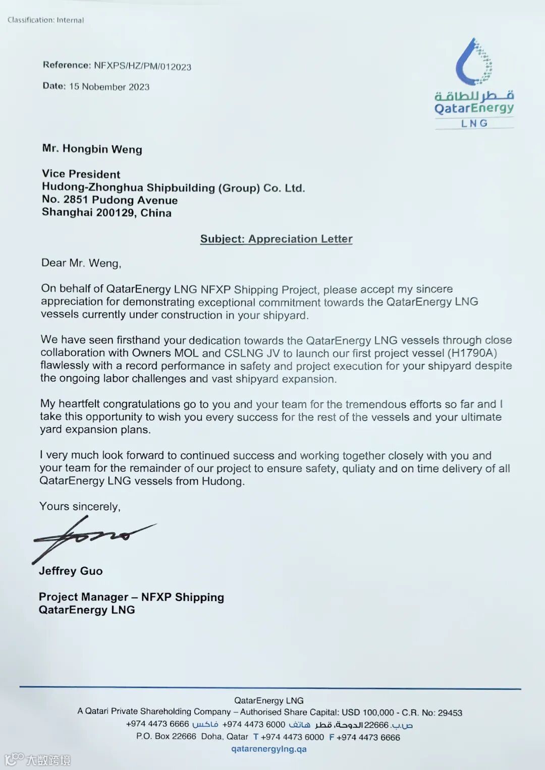 卡塔尔能源液化天然气公司北部气田项目经理郭晋挺向公司副总经理翁红兵致信感谢。他表示,沪东中华建造团队的工作成效令人惊叹,你们的辛勤工作战胜了劳动力不足和厂区扩建所带来的困难。项目首船码头建造有序推进,二号船即将出坞,同时在安全和项目执行力上创造了新记录。我们切身感受到沪东中华对本项目的重视和巨大奉献,让我坚信项目后续船一定会顺利建造,并按计划安全、优质地交付给船东。