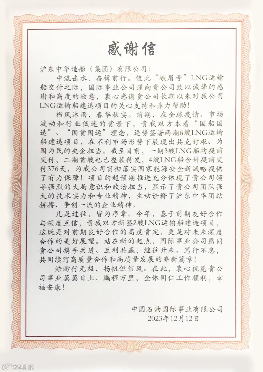 在“峨眉”号LNG船交付仪式上,中石油国事总经理戴琴荣向公司总经理陈军赠送感谢信。信中表示,衷心感谢沪东中华长期以来对国事项目的关心支持和鼎力帮助,项目一期3艘和二期首船均提前交付,4艘LNG船合计提前交付376天,项目超预期推进充分体现沪东中华领导强烈的大局意识和政治担当,显示沪东中华团队强大的技术实力和专业精神,生动诠释沪东中华团结拼搏、争创一流的精神。今年,基于前期的良好合作成果,双方又新签2艘LNG运输船建造项目,我们一定能携手共进,继往开来,共同续写高质量合作和高质量发展新篇章。