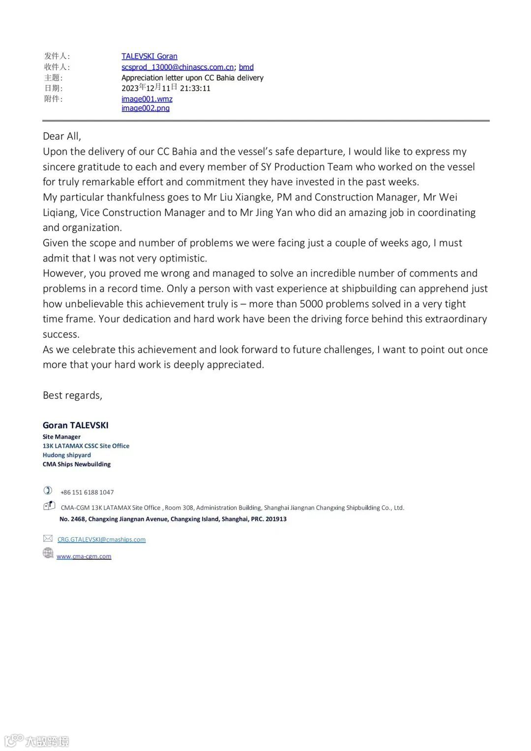 达飞集团13000TEU双燃料箱船驻场项目经理戈兰表示,在“达飞巴伊亚”轮投入运营之际,向建造团队每一位成员的卓绝努力和无私奉献表示感谢。几周前,新船建造还面临着诸多难题,那时我们对交船并不乐观。但是,建造团队用有力行动证明了我们的悲观是错误的,你们在创纪录的短时间内解决了诸多意见,你们所付出的忘我奋斗精神和艰苦奋斗态度是令人敬佩的,再次对你们的辛勤工作表示深深感谢。