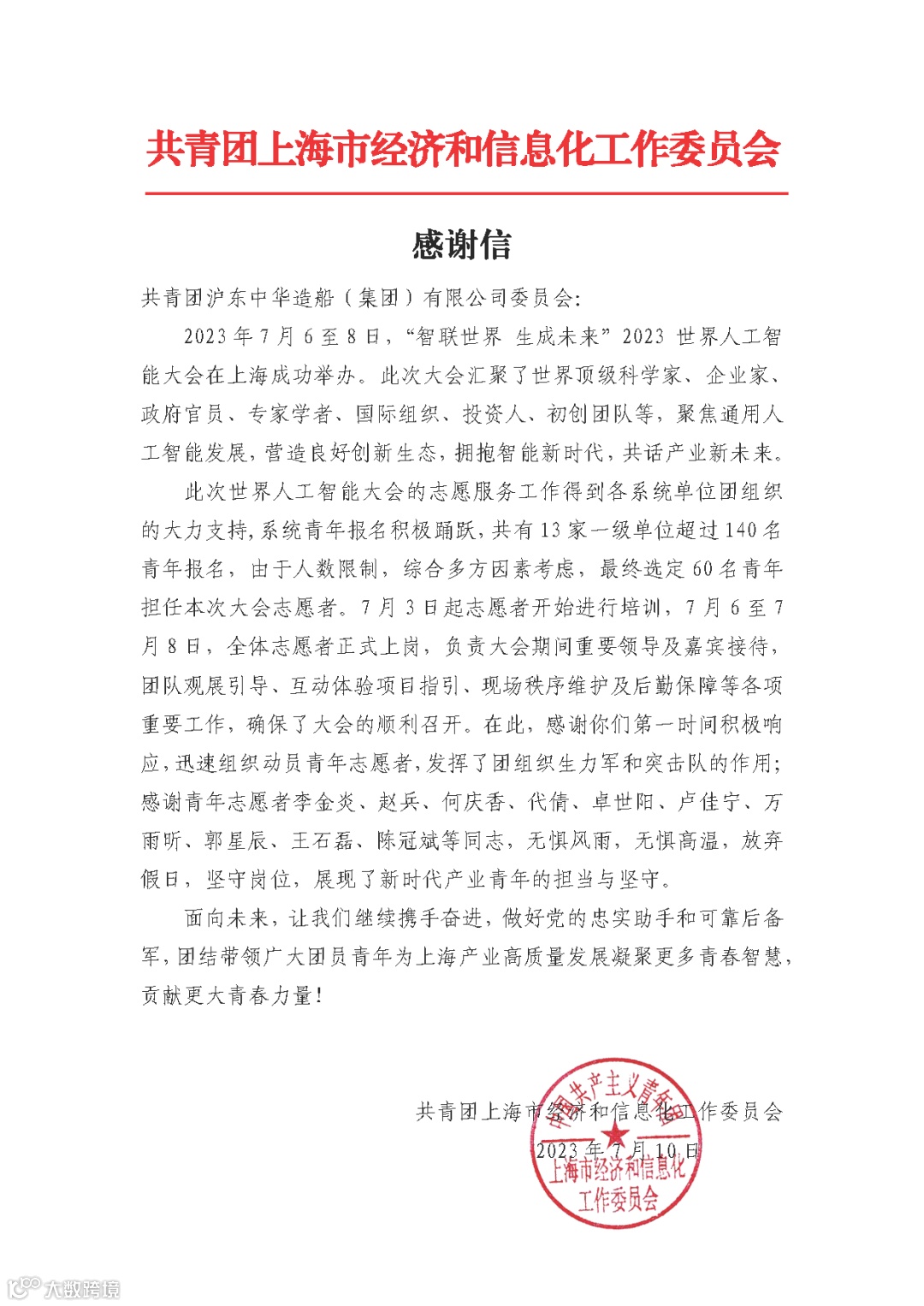 共青团上海经济和信息化工作委员会特发来感谢信,肯定了公司青年展现出的担当与坚守。