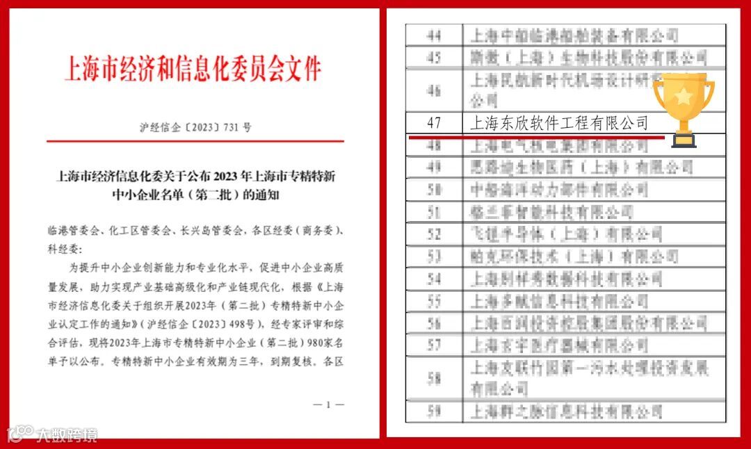 近日,上海市经济和信息化委员会公布《2023年上海市专精特新中小企业(第二批)名单》,东欣公司荣获“专精特新中小企业”称号,这是上海市政府部门及专业机构对东欣公司综合实力、自主创新能力、在细分市场领域的市场竞争力以及成为行业领军企业潜在能力的高度认可。