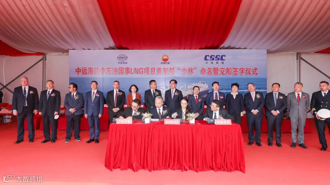 上海中远海运液化天然气投资有限公司党总支书记、副总经理林楠,中远海运石油副总经理纪明斯作为联合买方代表;中石油国事总经理武军利代表租家;公司副总经理迟本斌,中船贸易副总经理吴爱军作为联合卖方代表,分别签署项目交船和租船文件。